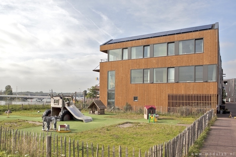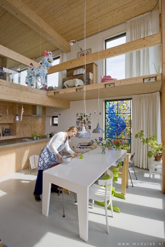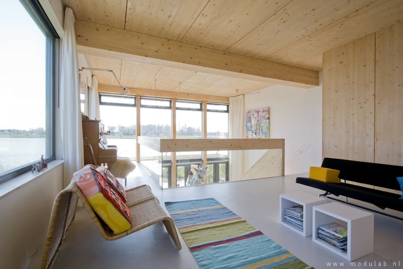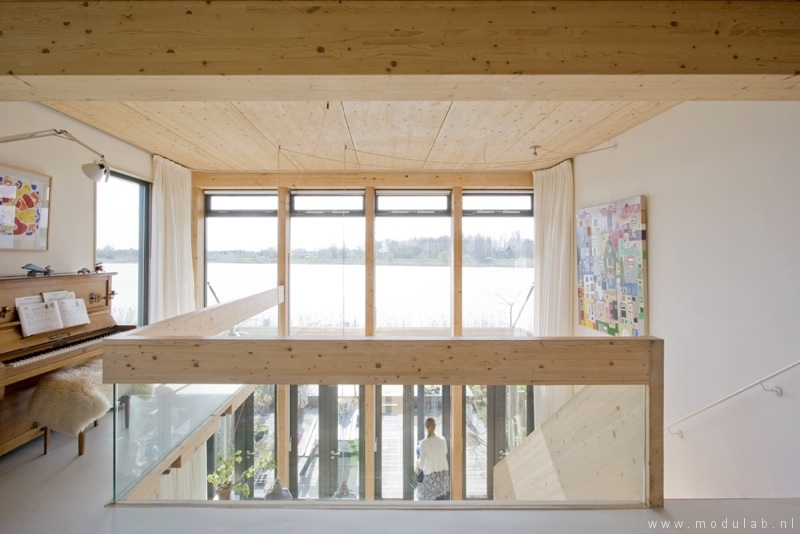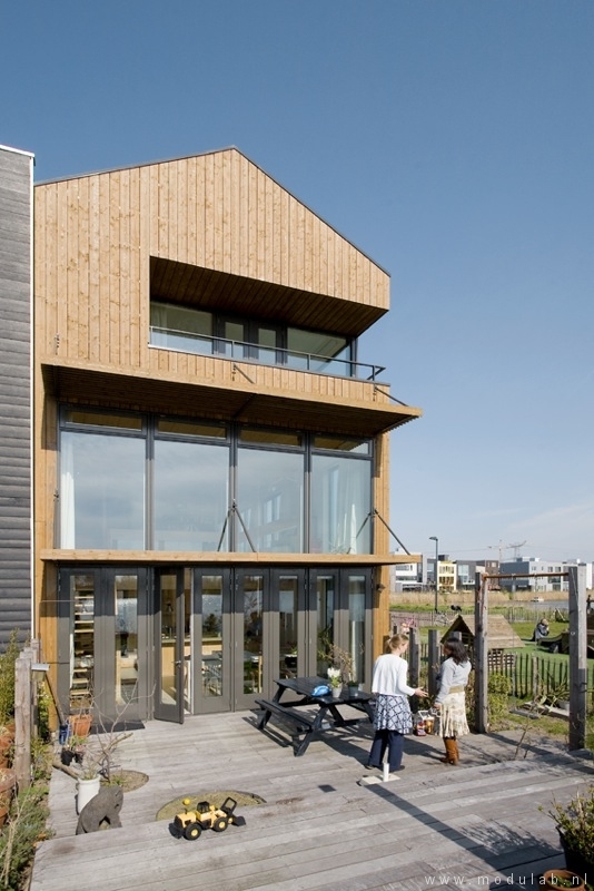 Woonhuis volledig opgebouwd uit hout. Een constructie van vuren massiefhouten vloer- en wandelementen in combinatie met houtskeletbouw wanden. Gebruik van duurzame materialen, o.a. thermowood (vuren)gevelhout, vlasisolatie en fermacell vezelplaten. Het ontwerp is cradle-to-cradle.