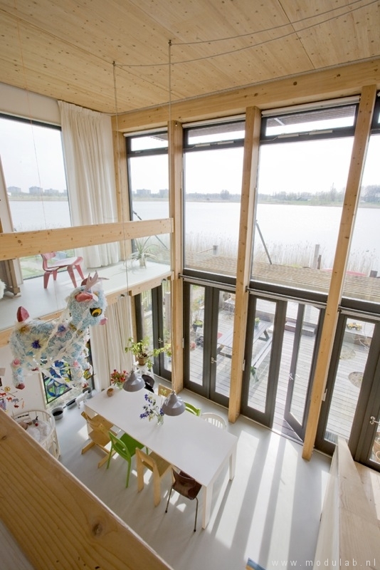De woonkeuken op de begane grond vormt het centrum van het huis. Een grote vide verbindt deze ruimte met de woonkamer op de eerste verdieping. De enorme ramen bieden vanaf elke verdieping prachtig uitzicht op het water en halen het daglicht volop binnen. De semi-transparante houten zonwering is zo geplaatst dat hij zomers als de zon hoog staat de hitte buiten houdt, maar de laagstaande winterzon juist ongehinderd binnenlaat.